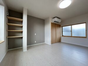 もともと和室だった部屋の壁を塗装し、和の要素も残しながら洋室にチェンジしました。子供室を想定し、下階に物音が響きにくい様、 タイルカーペットを採用。 パイルのテクスチャー・デザインが、 柔らかな空間を演出します。